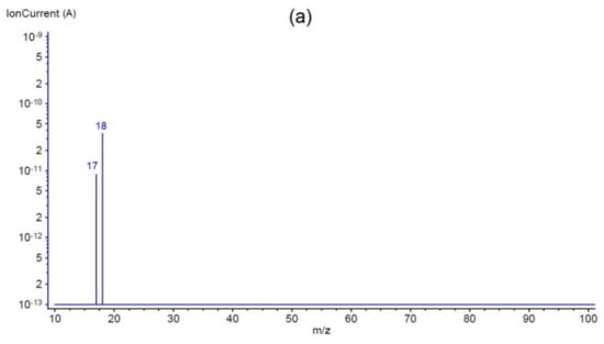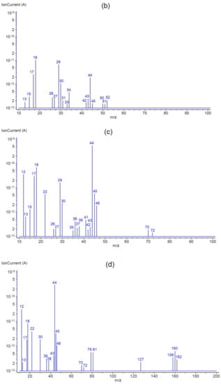 Representative mass spectra of volatile products of the first (a) and the second (b) stages of the thermal decomposition of C1–C4, as well of the third stage of the thermal decomposition of C1–C3 (c) and C4 (d). The correction of the mass spectra included subtracting the background spectrum and the application of automatic software correction for the carrier gas.