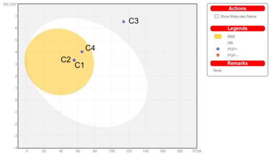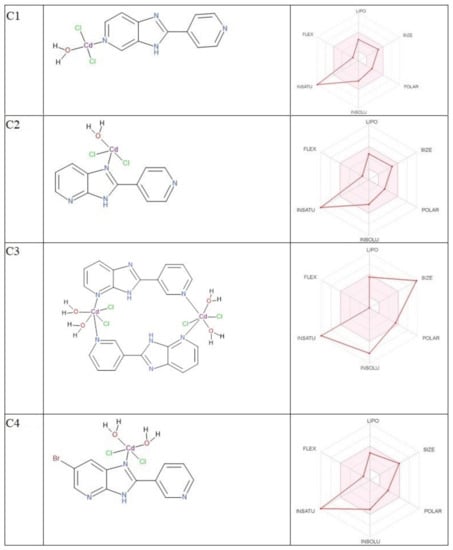 Bioavailability radars were used for all complexes (Figure 5). The pink-colored zone on the bioavailability radar was made in the SwissADME service; it represents the optimal range for each property to indicate the drug-likeness of a molecule: Lipophilicity (LIPO) was within the range –0.7 < XlogP3 < +5.0; molecular weight (SIZE) was within the range 150 g/mol < MW < 500 g/mol; polarity (POLAR) was within the range 20 Å2 < TPSA < 130 Å2; insolubility (INSOLU) was within the range 0 < logS < 6; insaturation (INSATU) was within the range 0.25 < Fraction Csp3 < 1; flexibility (FLEX) was within the range 0 < Num. rotatable bonds < 9. The non-dimer complexes met the rules of Lipinski [42], Ghose [43], Egan [44], Veber [45], and Muegge [46]. Only the dimer complex C3 did not indicate good brain penetration or oral bioavailability. Coordination compound C3 was too large, and its molecular weight exceeded the limit of 800 g/mol (831.11 g/mol) for being an obvious candidate as a drug. Gastrointestinal absorption and brain access are pharmacokinetically important properties when searching for a new drug. The BOILED-Egg graph was used to predict the penetration by computing the lipophilicity and polarity of the molecules. In the BOILED-Egg diagram (Figure 6), this complex clearly differed from the other coordination compounds. Servis ProTox II classified compounds C1, C2, and C4 into toxicity class 4 (predicted LD50: 1000 mg/kg for C1; predicted LD50: 750 mg/kg for C2; predicted LD50: 450 mg/kg for C4) and compound C3 into toxicity class 5 (predicted LD50: 2257 mg/kg).