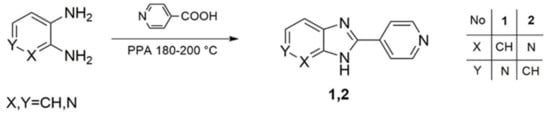 Ligands L1 and L2 were synthesized through the condensation and cyclization of 2,3-diminopyridine or 3,4-diaminopyridine with isonicotinic acid in PPA (polyphosphoric acid) (Scheme 1) and ligands L3 and L4 were obtained by reacting 2,3-diaminopyridine or 5-bromo-2,3-diaminopyridine with 3-pyridinecarboxaldehyde in the presence of boric acid in a mixture of water and DMSO (Scheme 2). We previously described these syntheses [36].