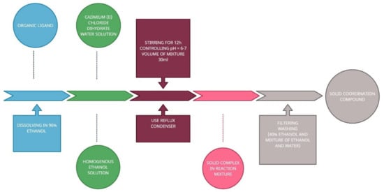 The starting materials in the form of benzimidazole derivatives (0.25 mmol) and cadmium chloride dihydrates (0.25 mmol) used for the synthesis were dissolved in 96% v/v ethanol until homogeneous solutions were obtained. Then, they were mixed using a reflux condenser for about half a day. The total volume of the reaction mixture was 30 mL. The reaction was carried out under the conditions of a constant room temperature (25 °C) and controlled pH (6–7) until the formation of precipitates of the coordination compounds, which were then washed with 40% EtOH and a mixture of EtOH and H2O (vol = 1/1). The reaction products were air dried at room temperature (Scheme 3). The newly synthesized coordination compounds were characterized through an elemental C/H/N analysis, and the determination of Cd (II) content was carried out by using FTIR spectra and the TG-MS technique.