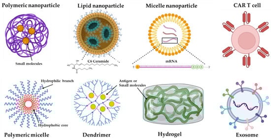 NPs can deliver antibodies or their fragments, peptides, proteins, and small molecules and their antagonists, such as IL-2, TGF-β inhibitors, CpG oligodeoxynucleotides, and anti-PD-1 mAbs [128,129]. There are many platforms for NPs, including liposomes, inorganic nanocarriers, dendrimers, polymeric systems, nucleic acid nanotechnology, and exosomes [130]. Some examples are shown in graphic cartoons (Figure 2).