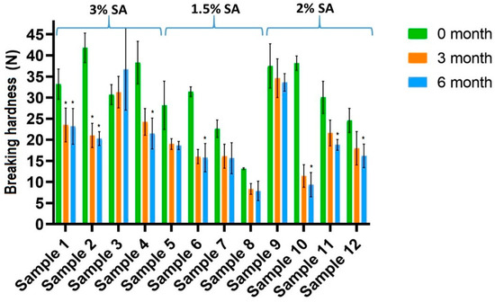 Breaking hardness of the prepared films (Samples 2, 4, 6, 8, 10, 12 contain CA) (* p < 0.05; n = 6). The samples were compared to the freshly prepared sample (0 months).