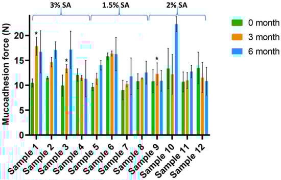 Based on our results, SA showed excellent mucoadhesion properties, which correlates with data from the literature [,]. Films without HPMC showed a higher rise in mucoadhesion force compared with the films without HPMC (Samples 1–4), so it can be said that HPMC can enhance the stability of the structure formed during the investigated period because the changes of mucoadhesion force in the films containing HPMC are smaller than in the case of the films without HPMC. Moreover, these results suggest that the films containing CA have higher in vitro mucoadhesion force, especially in the case of the 6-month samples, than the films without CA. The GLY concentration can also influence the mucoadhesivity of films. Films with a higher GLY concentration may cause lower growth and growth rate in mucoadhesivity. This observation may be due to the fact that high amounts of GLY can build better in the polymer film structure; therefore, during storage, fewer chains are free that are able to bind to the mucin of the buccal mucosa.