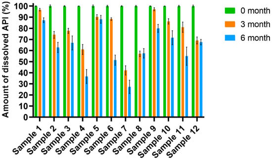 Figure 3 shows the results of the change in content during 6 months of storage. The results are marked in different colours for the different times of the investigation. In Figure 3, the results appear numerically for the compositions that can preserve more than 85% of the API after 3 or 6 months, according to pharmacopeia expectations. As expected, a decrease can be observed for each sample under the forced condition during storage. The reductions in the amount of the API were higher at the beginning of the investigation, while later, the changes were smaller. The changes were larger for films containing CA, so it can be concluded that CA can decrease the stability of films. GLY can also enhance the decomposition of the API. It was found that films with a larger amount of GLY had a lower amount of API after 6 months than films with a low amount of GLY, so higher GLY concentrations in the films can also reduce film stability. The reason for this is that films with a high GLY concentration have a higher water content because of the water-retention effect of GLY, and a higher water content can increase decomposition. As can be seen, Sample 1 and Sample 5 can preserve the required amount of the API after 6 months, while Sample 6, Sample 9 and Sample 10 can preserve it after 3 months.