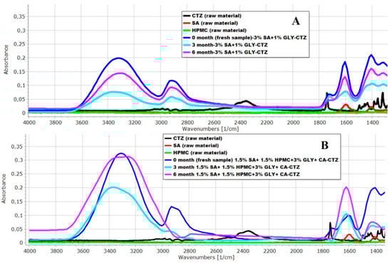 The prepared films were investigated with FT-IR spectroscopy to determine the interactions between the components of the films. In Figure 4, the FT-IR spectra of the films can be seen. Part “A” of Figure 4 shows the film composition with the largest amount of API (Sample 1) after 6 months, while in the bottom figure, the film composition with the least amount of API is presented (Sample 8). As can be seen, the carboxyl group of CTZ can be detected at 1739 cm−1 in the FT-IR spectrum. In the spectrum of CTZ as a raw material, this peak can be sharply distinguished. However, in the films, this peak was shifted to the higher wavenumbers. In Sample 1 (Part “A” of Figure 4), the CTZ peak was shifted towards a higher wavenumber, but the intensity of the peak was smaller than in the case of the raw material. In Part “B” of Figure 4, for Sample 8, the peak disappears completely after 6 months, which shows that the amount of the API decreased because of the forced condition during storage, and hydrogen bonds were formed between SA, HPMC and the carboxylic group of CTZ, which can cause more remarkable structural changes, as seen in the results of the breaking hardness measurement. In addition, there are important bands in the higher wavenumber region. A spectral peak can be found at 2384 cm−1, which shows the stretching vibration of the N-H group of CTZ. This peak disappears in every sample, regardless of the GLY concentration. This observation may suggest that interactions develop in the films between the N-H-group of CTZ and the other components of the films. Overall, it can be stated that the decomposition of the API was greater in CA-containing films than in the ones without CA. Moreover, interactions can occur between the components of the films, mostly in the form of hydrogen bonds, which can greatly affect the breaking hardness of the films.