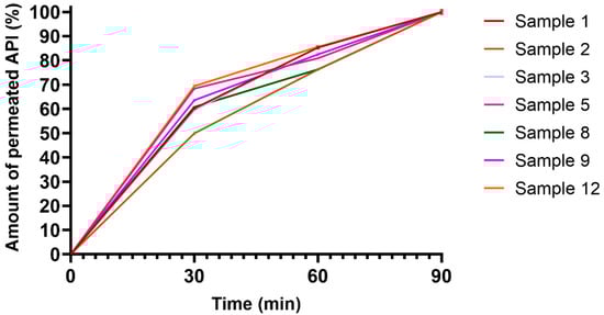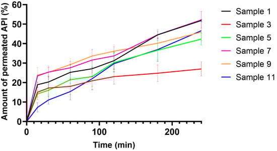 Figure 5 shows the results of the permeation test across an artificial cellulose membrane. The permeation curves of films of different compositions are shown. From most compositions, more than 40% of the API can permeate to the acceptor compartment. The SA concentration can influence the amount of the permeated API. A higher amount of the API can permeate to the acceptor compartment from the films with a higher SA concentration than from the ones with a lower SA concentration. This correlation is shown in Figure 5, where Sample 1 (brown curve) has a higher permeation rate than the comparable samples (Sample 5—purple curve, Sample 9—green curve). The same correlation can be observed for Sample 3 (yellow curve) and Sample 11 (red curve). Furthermore, it can also be stated that the GLY concentration did not influence the permeation rate and speed of the API.