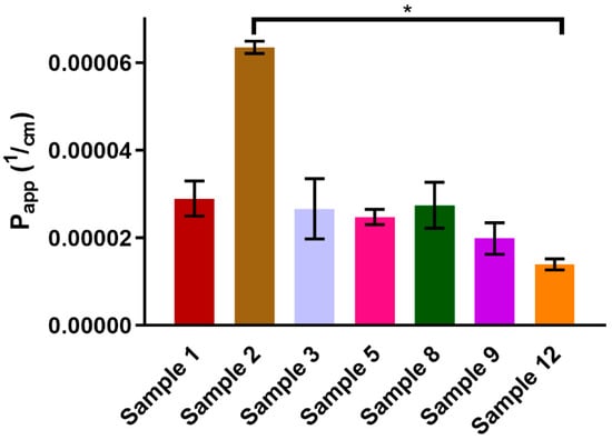 Apparent permeability values of buccal films calculated from the permeability rate of CTZ between 60 and 90 min. Each film was investigated in three separate, parallel cell culture inserts (n = 3). * Significant difference was found only between Sample 2 and Sample 12.