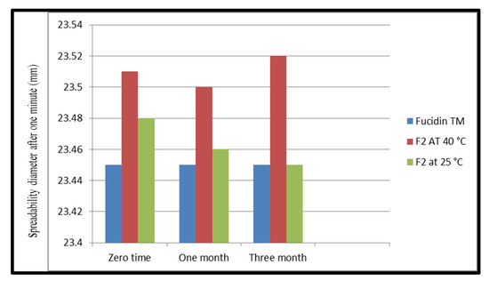 The values in Figure 1 illustrate the spreading diameter after one minute. The spreadability diameter indicates the range of the area to which the formulation easily expands upon skin application by a small amount of shear [37]. No apparent change in spreadability was observed with increased storage conditions from 25 °C to 40 °C (n = 3). The mean ± standard deviation of spreadability for the F2 samples at different conditions ranged from 23.5 ± 0.25 g·cm/s to 23.48 ± 0.3 g·cm/s. The results showed that formula F2 is more likely to have better spreadability than trade products.