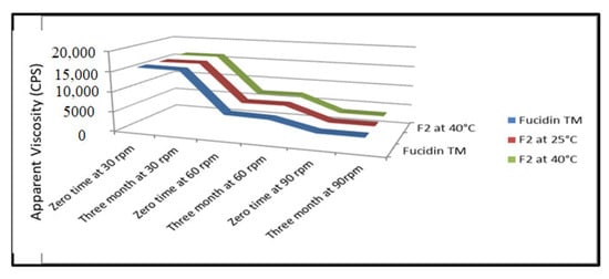 The viscosities of the F2 formula and FucidinTM were determined, and the results are shown in Figure 2. The viscosity for F2 at 30 rpm was found to be 15,160 ± 1.25 cps, while Fucidin TM was found to be 14,550 ± 1.05 cps, which are within the acceptable limits [24]. The viscosity decreased over shear stress, and it was clearly explained that the viscosity of F2 at 0 time and 3 months at 40 °C was found within acceptable limits. It is supposed that a non-Newtonian behavior with the pseudoplastic flow was seen in both formulas. It is evident from Figure 2 that as the rpm or shear stress increased, the viscosity decreased in both formulations. In conclusion, the resistance to flow of FucidinTM was low compared to F2 by pouring the formulations out of the container.