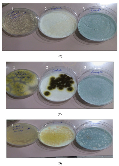 (A) (1): Cultured pathogen, (2): FucidinTM (control), and (3): F2 (sample) effect on E.coli isolate. (B) (1): Cultured pathogen, (2): FucidinTM (control), and (3): F2 (sample) effect on C. albicans isolate. (C) (1): Cultured pathogen, (2): FucidinTM (control), and (3): F2 (sample) effect on A. niger isolate. (D) (1): Cultured pathogen, (2): FucidinTM (control), and (3): F2 (sample) effect on P. aeruginosa isolate. (E) (1): Cultured pathogen, (2): Fucidin TM (control) and (3): F2 (sample) effect on S. aureus isolate.