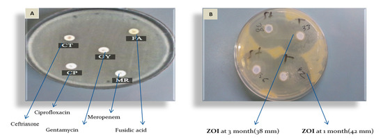 There were no zones of inhibition observed on the agar plates with fucidinTM in the FRSA samples (Figure 4A), but the zone of inhibition increased in the F2 (Figure 4B) plate to an average of 37.25 mm from the first to the third month.