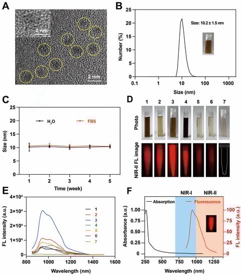 In this work, NIR-II emissive BSA@Au was synthesized by the biomineralization method. BSA was used as a template and protector for the growth of BSA@Au, and NaBH4 was introduced as the critical reductant to modulate the NIR-II FL emission intensity. As shown in the high-resolution transmission electron microscope (HRTEM) image, the core size of BSA@Au was ~2 nm (Figure 1A), which was below the glomerular filtration cutoff (~6 nm) for renal clearance after i.v. injection [,]. The hydrodynamic diameter of BSA@Au was 10.1 ± 1.4 nm and stayed highly stable after four weeks of storage in water or fetal bovine serum (FBS) (Figure 1B,C). The size of BSA@Au measured by dynamic light scattering (DLS) was larger than that determined by HRTEM because DLS detected an average hydrodynamic size whereas the HRTEM images exhibited the dehydration morphology of BSA@Au [].