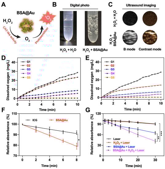 Catalase (CAT)-like activity and 1O2 generation ability of BSA@Au. (A) Scheme of BSA@Au worked as a catalase mimic and photosensitizer in cascade reactions. (B) Photograph of bubbles generated from reaction between BSA@Au and H2O2. (C) Bubbles generation imaged by ultrasound device on B mode and contrast mode. (D) O2 production from H2O2 of different concentrations decomposed by BSA@Au. G1: H2O2 (12.5 mM) + BSA@Au (0.23 mM); G2: H2O2 (9.37 mM) + BSA@Au (0.23 mM); G3: H2O2 (6.25 mM) + BSA@Au (0.23 mM); G4: H2O2 (1.25 mM) + BSA@Au (0.23 mM); G5: H2O2 (12.5 mM) + H2O. (E) O2 production from H2O2 catalyzed by BSA@Au of various concentrations. G1: H2O2 (12.5 mM) + BSA@Au (0.23 mM); G2: H2O2 (12.5 mM) + BSA@Au (0.12 mM); G3: H2O2 (12.5 mM) + BSA@Au (0.06 mM); G4: H2O2 (12.5 mM) + BSA@Au (0.03 mM); G5: H2O2 (12.5 mM) + H2O. (F) 1O2 production efficiency of BSA@Au measured by DPBF in absorbance at 414 nm under 808 nm laser irradiation with ICG as a reference. (G) 1O2 generation measured by DPBF at 414 nm against time in the presence of different solutions. * p < 0.5, ** p < 0.01, *** p < 0.005.