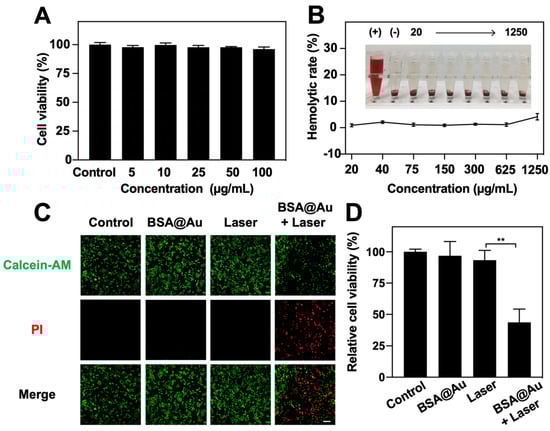 Cytotoxicity and in vitro anti-tumor PDT. (A) Cytotoxicity evaluation on 4T1 cells incubated with BSA@Au. (B) Hemolytic assay of BSA@Au on red blood cells (RBCs) from Balb/C mice. (+) represented RBCs solution mixed with ultrapure water; (−) indicated RBCs solution mixed with PBS. (C) Live/dead 4T1 cells visualization post PDT. The scale bar was 100 µm. (D) 4T1 cells viability post PDT. ** p < 0.01.