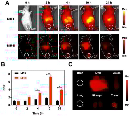 NIR-I and NIR-II FL imaging. (A) NIR-I and NIR-II FL images of 4T1 tumor-bearing mice at different time points (0, 2, 4, 10, and 24 h) post i.v. injection of BSA@Au. (B) SBR comparison between in vivo NIR-I FL and NIR-II FL images of 4T1 tumor-bearing mice. (C) The NIR-II FL images of main organs (heart, liver, spleen, lung, and kidneys) and tumor harvested from 4T1 tumor-bearing mice at 10 h post i.v. injection of BSA@Au. * p < 0.05, ** p < 0.01.