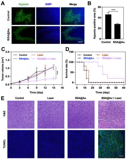 In vivo anti-tumor effect. (A) Representative immunofluorescence images of positive hypoxia area of tumor tissues after i.v. injection of PBS or BSA@Au. The scale bar was 100 µm. (B) The semi-quantification of positive hypoxia area shown in (A). (C) Tumor volumes variations over time after different treatments. (D) Survival rate of mice received different treatments. (E) H&E and TUNEL assay of tumor tissue sections from mice received different treatments. The scale bar was 100 µm. *** p < 0.005.