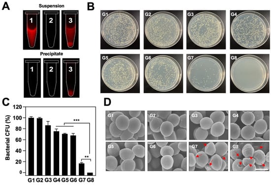 The anti-bacterial efficacy of BSA@Au. (A) Observation of BSA@Au binding with MRSA by NIR-II FL imaging. Tube 1, 2, and 3 contained the BSA@Au solution, MRSA solution, and the mixed suspension of BSA@Au and MRSA, respectively. (B) MRSA bacterial colonies test on LB agar plates after different treatments. (C) Quantification of survival rate of MRSA cells after different treatments. (D) Representative SEM images of MRSA exposed to different treatments. The red arrow indicates the crimple, hollow, and crack of MRSA. The scale bar was 1 µm. In (C,D), G1: PBS; G2: Laser; G3: BSA@Au; G4: H2O2; G5: BSA@Au + H2O2; G6: H2O2 + Laser; G7: BSA@Au + Laser; G8: BSA@Au + H2O2 + Laser. ** p < 0.01, *** p < 0.005.