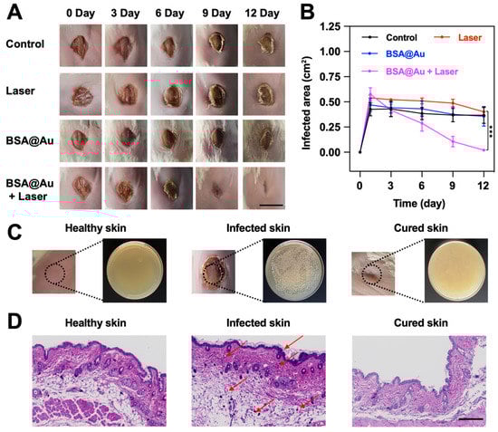 To investigate in vivo antimicrobial performance, the infected mice were randomly divided into 4 groups (n = 5): (1) Control; (2) Laser; (3) BSA@Au; (4) BSA@Au + Laser. Mice of groups (3) and (4) were locally treated with BSA@Au solution (2.5 mM, 20 μL) at wound sites. The wound areas and body weights were recorded every 3 days. After 12 days of treatments, the wounds were excised for H&E staining analysis.