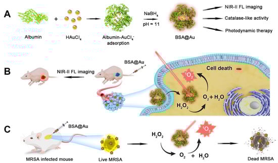 Scheme of NIR-II BSA@Au enhancing PDT. (A) Synthesis of NIR-II BSA@Au. (B) BSA@Au combining with PDT against breast cancer. (C) BSA@Au combining with PDT against methicillin-resistant Staphylococcus aureus (MRSA) infection.