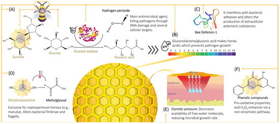 Key antimicrobial components of honey. (A) Sucrose from flowers is broken down by the bee into glucose and fructose. The bee’s hypopharyngeal glands secrete GOx. Glucose is then oxidised by the oxidised form of GOx, which results in the production of gluconolactone/gluconic acid and H2O2. Most of honey’s antimicrobial activity comes from H2O2, killing pathogens through DNA damage and several cellular targets. (B) Honey is acidic with an average pH of 3.91 (ranges between 3.4 to 6.1), which makes it powerful against microbial strains with an optimum pH of growth around 7. Acidity predominantly arises from gluconolactone/gluconic acid. (C) Bee Def-1 is an antibacterial peptide originating in the bee’s hypopharyngeal gland. It acts by interfering with bacterial adhesion to a surface, or in the early biofilm stage by inhibiting the growth of attached cells; and by altering the production of extracellular polymeric substances. (D) MGO is generated in honey during storage by the non-enzymatic conversion of dihydroxyacetone, a saccharide found in high concentrations in the nectar of Leptospermum flowers. The antimicrobial activity of MGO is attributed to alterations in bacterial fimbriae and flagella, which obstruct the bacterium’s adherence and motility. (E) Honey is a super-saturated solution of sugars. The strong interaction between these sugars with water molecules prevents the abundance of free water molecules (low water activity) available for microbes to grow. (F) The combination of different phenols act as an enhancer of honey’s antimicrobial efficacy. In alkaline conditions (pH 7.0–8.0), polyphenols can display pro-oxidative properties, inhibiting microbial growth by accelerating hydroxyl radical formation and oxidative strand breakage in DNA. They could also support the production of considerable amounts of H2O2 via a non-enzymatic pathway.