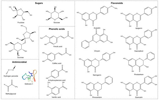 Compounds that can contribute to the overall antimicrobial properties of honey, including H2O2, def-1 (Swissmodel, P17722) [35], MGO (Leptospermum honeys only), flavonoids, phenolic acids, and sugars.