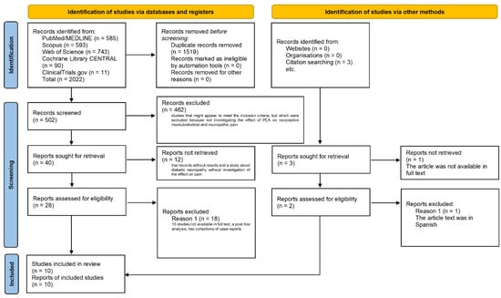 The search of databases retrieved 2022 results: 585 records from PubMed/MEDLINE; 593 records from Scopus; 743 records from WOS; 90 records from Cochrane Library (CENTRAL); and 11 records from ClinicalTrials.gov. Three studies were identified using other methods, i.e., reference list screening, including: the study by Gatti et al. [], which met the inclusion criteria, and thus was included; the study of Desio [], which had to be excluded because of the lack of a full text; and the article of Canteri and collaborators [], which could not be included because it was in Spanish. After duplicate removal (1520 duplicated studies), there were 502 records left. Title and abstract screening led to the elimination of the studies not meeting the inclusion criteria because they used a different design (studies not of a clinical nature, reviews, chapters and congress abstracts) or due to the intervention used (studies that might appear to meet the inclusion criteria, but were excluded because they did not investigate the effect of PEA on nociceptive musculoskeletal and neuropathic pain) and of the following records on: endometriotic/pelvic pain (NCT02372903, NCT04091789, [,,,,,,,,,,,]); mouth pain [,,]; and irritable bowel syndrome [,]. Therefore, 40 full-text studies were left to assess. Of these, 15 records were not available [,,,,,,,,,,,,,]. The Ms by Pieralice and colleagues [] was excluded because it investigated the effect of PEA on diabetic neuropathy, but not on pain. Moreover, trial records without results were excluded, including: NCT01851499, NCT01851499, NCT01491191, ACTRN12619000418178, ACTRN12621000039886, ACTRN12620001302943, NCT05317676, ACTRN12615000149561, CTRI/2021/08/036091, NCT04662827 and ACTRN12621000228886. The study by Cruccu and coworkers [] was excluded because it was a post hoc analysis of an excluded record not available in full text, and the studies by Hesselink and collaborators [,] were not included because they comprised a collection of seven case reports. Finally, 10 studies were included in the analysis, and 8 of them presenting comparable measures of the primary outcome (pain intensity reduction) were subjected to the meta-analysis. The process of selection of studies is illustrated in Figure 1.