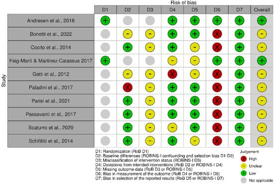 Robvis traffic light plot for the risk of bias of the studies included in the analysis. The studies’ RoB was assessed, according to their study design, with the revised Cochrane risk of bias tool for randomized trials, RoB2, and the Risk Of Bias In Non-randomised Studies of Interventions tool (ROBINS-I) for the assessment of effectiveness or safety (benefit or harm) of an intervention from nonrandomized studies on the effects of interventions (NRSI). The items assessed for RoB were: randomization; deviations from intended interventions; missing outcome data; bias in measurement of the outcome; and bias in selection of the reported results. Due to the nonrandomized study design, the outcomes assessed by ROBINS-I include baseline differences and misclassification of intervention status instead of the randomization domain.