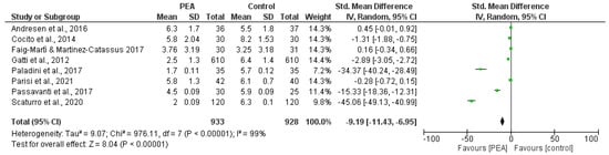 The systematic search of databases according to PRISMA 2020 recommendations retrieved 2022 results. Of these, ten records met the inclusion criteria and only eight shared comparable primary outcomes of pain intensity reduction and were thus included in the meta-analysis. The secondary outcome measures were not comparable among studies, thus making the meta-analysis not feasible []. Only two of these studies with the full text available were RCTs, while the others had a nonrandomized and blinded, open-label or observational design. The lack of adequately powered RCTs emerged; in fact, the nonrandomized and blinded, open-label or observational study design was a limitation of all the trials eligible apart from those by Andresen et al. and Faig-Martì and Martinez-Catassus, which present randomization and blinding as strengths. Other limitations linked to non-RCT study designs occurred in all the studies apart from the studies by Andresen et al. and Faig-Martì and Martinez-Catassus, which included a lack of deidentification of data and high risk of misclassification of the outcome measures. Moreover, the strengths of the study of Gatti and collaborators and the study of Scaturro and colleagues rely on the greatest sample sizes enrolled. The greatest strength of all the studies was the absence of reported missing outcome data due to drop-out. However, concerns regarding drop-out in terms of missing outcome data bias represent limitations of the trials by Faig-Martì and Martinez-Catassus, Gatti and collaborators and Scaturro and colleagues. Furthermore, during the study by Cocito and coworkers, three subjects dropped out for reasons not related to PEA-um administration. As previously demonstrated for the efficacy of nutraceuticals in treating glaucoma [], in the research field of dietary supplements, the number of RCTs is poor. The results obtained for a total of 933 patients demonstrate the efficacy of PEA over controls (p < 0.00001), in particular in the six nonrandomized studies included. However, this clinical analgesic efficacy is not generalizable because of the high heterogeneity of the studies (I2 = 99%) and the funnel plot suggests publication bias. This is in agreement with the finding of lots of studies not available as a full text. Efficacy in achieving a reduction in the need for rescue medication and improvement in functioning, neuropathic symptoms and quality of life is reported. In fact, although reporting the absence of a statistically significant effect of PEA-um on pain intensity reduction, the double-blind RCT by Andresen et al. points at a significant reduction in the use of rescue medications, represented by paracetamol (Δ mean:−2.2, 95% CI:−4.0 to−0.3, p = 0.02) []. Therefore, according to the authors, the main effect of PEA could be due to anti-inflammatory and neuroprotective properties elicited in animal models []. In fact, PEA is endowed with several actions, including: ATP-sensitive K ± channels []; downmodulation of mast-cell activation [] in inflammation; and inhibition of nuclear factor kB (NF-kB) signaling in the dorsal horn []. The reduction in paracetamol needed as rescue medication is reported also in the study by Passavanti and collaborators []. In the overall study evaluation PEA is well-tolerated. The study of Parisi et al. [] demonstrated the efficacy of Kalanit® for CHFD as well, in agreement with the study by Passavanti et al. [] showing its efficacy in achieving a decrease in the ODQ score and with the study by Scaturro and colleagues [] reporting significant improvement in quality of life and the mental component. The need for further research in the field and a head-to-head comparison of different PEA formulations is supported by the study of Gabrielsson et al. [], showing through access to raw data of trials, open-label and case-control studies, that the quality of key studies is poor. The most adequately powered study not included in this analysis as it is not available as a full text is the study by Guida et al., which enrolled 636 patients with lumbosciatic algias and proved the efficacy of PEA [,]. A previous meta-analysis dating back to 2017 [] had already highlighted the small number of trials assessing pain due to widely differing conditions, thus pointing at the various study designs for obtaining data in this research field. These are great limitations that do not allow for definite conclusions to be drawn about the efficacy of PEA for the reduction in pain intensity and the need for rescue medications. The present meta-analysis demonstrates the statistically significant (p < 0.00001) efficacy of PEA over controls for a total of 933 patients, although the two RCTs by Andresen et al. and Faig-Martì and Martinez-Catassus did not show the efficacy of PEA. As previously described, the study limitations include the high heterogeneity of the trials eligible (I2 = 99%), the risk of bias due to non-RCT study design and the highlighted publication bias. Therefore, the findings on the efficacy of PEA for the reduction in pain intensity and the need for rescue medications require confirmation through rigorous RCTs on musculoskeletal and neuropathic pain.