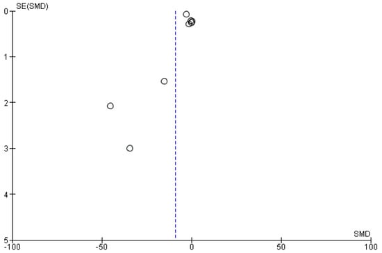 Standardized mean differences (SMDs) and inverse variance were calculated for continuous variables through the Cochrane Review Manager 5.3 (RevMan5.3; Copenhagen: The Nordic Cochrane Center, The Cochrane Collaboration). No sensitivity analysis (i.e., restricting the primary analysis to low-risk-of-bias studies) or following subgroup analysis or meta-regression based on stratification of the studies according to the judgement of the risk of bias was performed because of the small number of studies meeting the inclusion criteria. The random-effect model [] and the Higgins I2 value [] were used to evaluate the heterogeneity of the studies. The publication bias was assessed through Egger’s linear regression test [] for funnel plot asymmetry [], adjusted through the “trim and fill” method [].