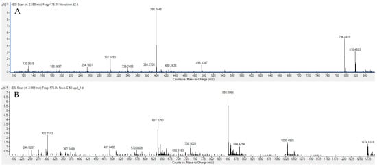 Extracted ion chromatogram (EIC) of (A) novokinin and (B) Novo Conj through LC/Q-TOF.