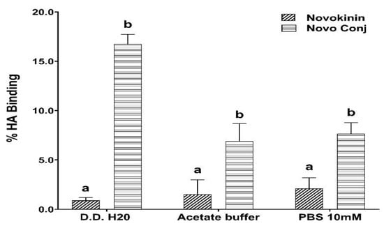 Novokinin conjugate (Novo Conj) shows higher hydroxyapatite (HA) binding affinity than novokinin. Samples were run in triplicate. Data labeled with different letters (a or b) indicate a statistical difference between groups where p < 0.05.