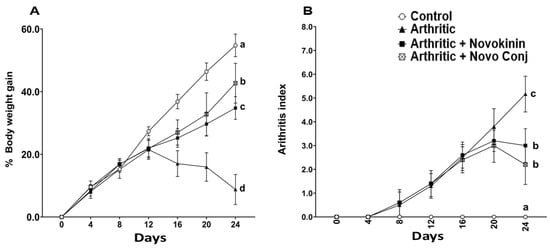Treatment with novokinin conjugate (Novo Conj) restored body weight (A) and decreased arthritis index (AI) score (B). Data labeled with different letters (a, b, c, or d) indicate a statistical difference between groups where p < 0.05.