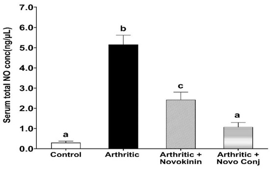 NO is a marker of nitrosative stress, and it directly participates in the pathogenesis of RA, as reported in several studies [,]. So, we measured serum total NO as an indication of resolution of inflammation by the treatment of Novo Conj. The treatment with novokinin or Novo Conj reduces elevated NO levels with more significant effects seen in Novo Conj-treated rats, as shown in Figure 4.