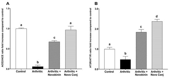 Novokinin conjugate (Novo Conj) increased mRNA expression of (A) the ratio of angiotensin-converting enzyme 2 (ACE2)/angiotensin-converting enzyme (ACE) and (B) the ratio of angiotensin type II receptor (AT2R)/angiotensin type I receptor (AT1R) in cardiac tissues. Mean ± SD (n = 5 or 6). Triplicates samples were run. Data labeled with different letters (a, b, c, or d) indicate a statistical difference between groups where p < 0.05.