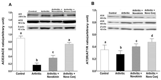 Novokinin conjugate (Novo Conj) increased protein expression of (A) angiotensin-converting enzyme 2 (ACE2)/angiotensin-converting enzyme (ACE1) and (B) angiotensin type II receptor (AT2R)/angiotensin type I receptor (AT1R) ratio in cardiac tissues. Mean ± standard deviation of the mean (n = 5 or 6). Triplicates samples were run. Data labeled with different letters (a, b, c, or d) indicate a statistical difference between groups where p < 0.05.