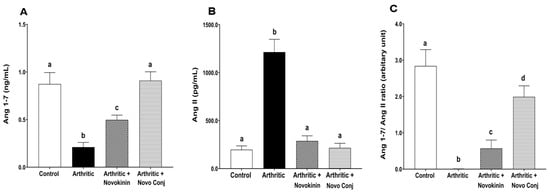 Novokinin and novokinin conjugate (Novo Conj) significantly increased angiotensin 1-7 (Ang 1-7) (A), decreased angiotensin II (Ang II) levels (B), and increased the Ang1-7/Ang II ratio (C) in plasma of adjuvant-induced arthritis (AIA) rats. Mean ± SD (n = 5 or 6). Triplicates samples were run. Data labeled with different letters (a, b, c, or d) indicate a statistical difference between groups where p < 0.05.