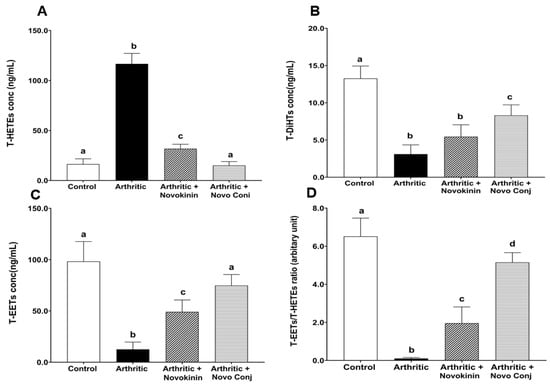 Impact of novokinin and novokinin conjugate (Novo Conj) treatment on total-HETEs (T-HETEs) (A), Total-DiHTs (T-DiHTs) (B), Total-EETs (T-EETs) (C), and the ratio of T-EETs/T-HETEs (D) arthritic rats plasma. Mean ± SD (n = 5 or 6). Data labeled with different letters (a, b, c, or d) indicate a statistical difference between groups where p < 0.05.