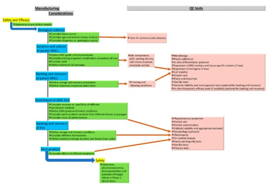 The manufacture and QC of EVs derived from unmodified cells are simpler compared to those for EVs isolated from apparently more complicated, genetically modified cells. More stringent regulations by health authorities are anticipated. The potential risks due to the vector and the specific transgene used for cell transformation should be identified and controlled in the manufacturing and QC procedures. Furthermore, endotoxin, bacterial, fungal, mycoplasma, adventitious viral, genomic stability (such as karyotyping) and in vitro tumorigenicity tests (such as soft agar colony formation assay) of MSC culture should be done.