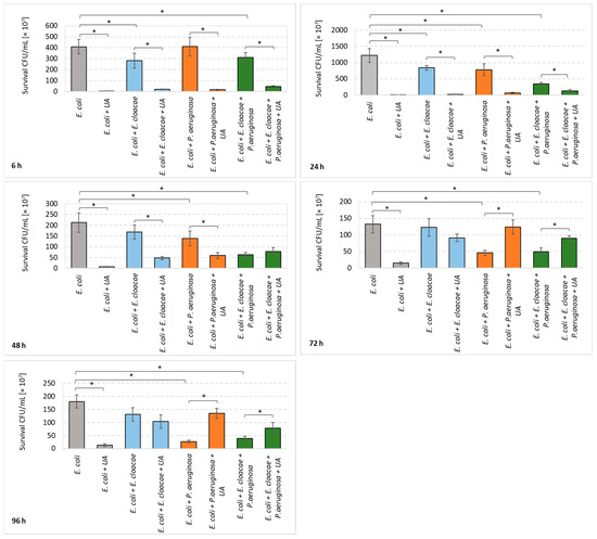 Comparing the number of live E. coli cells in single- and dual-species biofilms (E. coli + E. cloacae; E. coli + P. aeruginosa) untreated with UA, it was found that the presence of both E. cloacae and P. aeruginosa rods limited the abundance of the E. coli strain (Figure 1). A statistically significant reduction in the number of E. coli cells (p ≤ 0.05) was noted in the E. coli + E. cloacae biofilm after 6 and 24 h and in the E. coli + P. aeruginosa biofilm at all stages of its formation, except for the young 6 h culture. The data present in Figure 1 also show that the simultaneous presence of E. cloacae and P. aeruginosa in the triple-species consortium (E. coli + E. cloacae + P. aeruginosa) significantly limited the growth of E. coli at all stages of its formation compared to the growth of E. coli in monoculture (p ≤ 0.05).