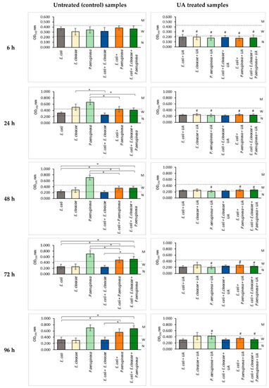 The impact of ursolic acid (UA) on biofilm mass production by bacteria living in single-, dual-, and triple-species biofilms. Statistically significant differences (p ≤ 0.05) were noted with an asterisk (*) when untreated samples were compared with each other or with a hash (#) when UA-treated samples were compared to their untreated controls. N—no biofilm; W—weak biofilm; M—moderate biofilm. The experiment was repeated three times. The optical density was read from six wells of the microtiter plate, giving a total of 18 repeats. The final results are average values.