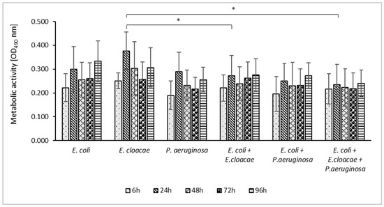 The results presented in Figure 3 indicate that E. cloacae in the 24 h culture and E. coli in the 96 h consortium showed the highest metabolic activity. Analyzing the metabolic activity of bacteria growing in the dual-species E. coli + E. cloacae biofilm, it was found that their metabolic activity was significantly lower than that of E. cloacae growing in monoculture (p ≤ 0.05).