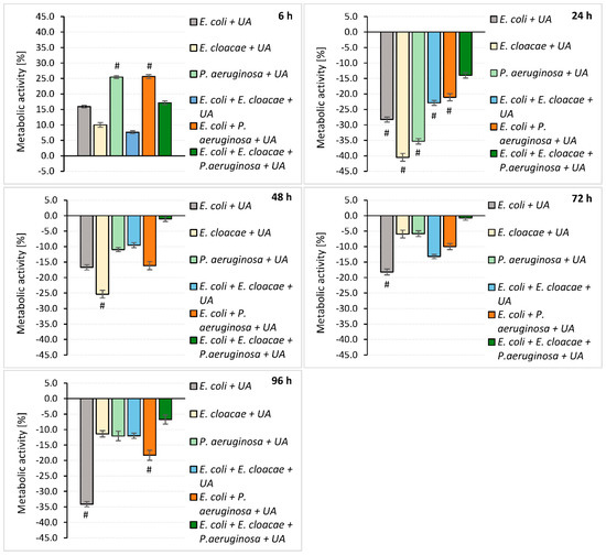In older biofilms, UA was less effective, significantly reducing only the metabolic activity of E. cloacae rods after 48 h (25.4% reduction), E. coli rods after 72 (18.2%) and 96 h (34.1%), and E. coli + P. aeruginosa after 96 h (18.3%) of incubation (p ≤ 0.05).