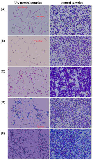 In biofilm cultures of reference E. coli CFT073 (ATCC 700928), E. cloacae ATCC-BAA 2468, P. aeruginosa ATCC 25000 strains treated with UA, short and long filaments and “ghost” cells partially devoid of the cell wall were observed. Similar morphological cell changes in clinical E. coli strains were observed [32]. The authors also found the presence of thickened cells with intracellular distension of the “swollen” type [32]. Wojnicz et al. [41] examined the effect of UA on biofilms formed by clinical strains of Enterococcus faecalis. The cells of these cocci had a larger diameter and formed irregular aggregates instead of the characteristic chains visible in UA-untreated cultures. The morphological changes in bacterial cells under the influence of UA were also observed by others. Kurek et al. [23] found that after 24 h of incubation in the presence of UA, the length of Listeria monocytogenes bacterial cells was reduced by 20% compared to control. Catteau et al. [39] showed that UA, like the β-lactam antibiotic oxacillin, caused the delocalization of the penicillin-binding protein (PBP2) from the site of the division septum and its redistribution throughout the cell membrane, which disrupted S. aureus cell division.