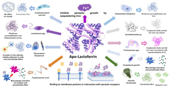 Effect of apo-lactoferrin on pathogenic protozoa. The activity of apo-Lf is to inhibit the growth of infectious agents through iron chelation, pathogen death by membrane destabilization, or parasite neutralization by binding to its receptor. In addition, the activity exerted by apo-Lf is also specified in each pathogen.