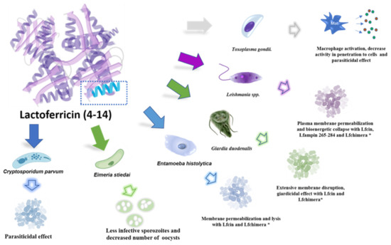 Although there are many reports of Lf activity toward different microorganisms, there are few tests toward parasites, especially toward coccidia, for which there is only one report. In 2001, Omata et al. tested the effectiveness of bLfcin against E. stiedai in vivo (rabbits and mice) and in vitro (rabbit hepatobiliary cells and mouse embryonic cells) using two different concentrations of Lfcin, 100 or 1000 ug/mL, and E. stiedai sporozoites at an inoculum of 106 parasites/ml and incubated for 18 h. Subsequently, the sporozoites were fixed to observe the effect, 105 from each treatment were inoculated intravenously, and the animals were monitored for 60 days after inoculation. Sporozoites treated with 1000 µg/mL bLfcin showed less infectivity and less penetration into host cells than untreated sporozoites. The rabbits inoculated with sporozoites at this dose presented a lower number of oocysts, the livers had fewer abscesses and they did not present inflammation of the bile ducts [35]. As the authors noted, more experiments are needed to determine a more effective dose and test different routes of administration and other forms of Lf.