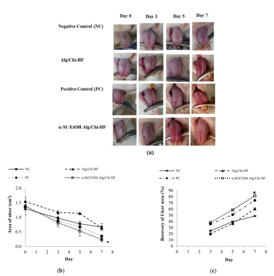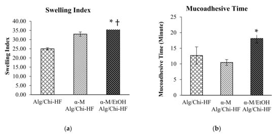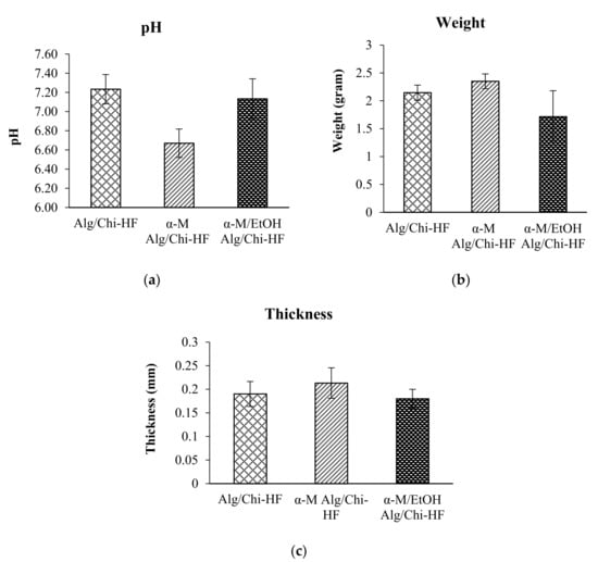 3.2. Physicochemical Properties of Alg/Chi HF, α-M Alg/Chi HF, and α-M/EtOH Alg/Chi HF