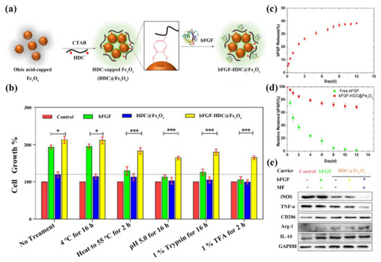 (a) Diagrammatic sketch of bFGF-HDC@Fe3O4 fabrication; (b) cell growth rate of NIH 3T3 cultures in groups of free bFGF, HDC@Fe3O4, and bFGF-HDC@Fe3O4 exposed to various conditions, for statistical significance, * p < 0.05 and *** p < 0.001; (c) bFGF release behavior of bFGF-HDC@Fe3O4; (d) bFGF bioactivity evaluation of bFGF-HDC@Fe3O4 (red) and free bFGF (green); (e) expression analysis of proinflammatory macrophage-associated proteins (iNOS and TNF-α) and anti-inflammatory phenotype macrophage-associated proteins (CD206, Arg-1, and IL-10) through Western blot. CTAB, hexadecyl trimethyl ammonium bromide; HDC, dopamine heparin conjugate; HDC@Fe3O4, heparin dopamine conjugate-coated Fe3O4 nanoparticles; bFGF, basic fibroblast growth factor; TFA, trifluoroacetic acid. Adapted with permission from [25], published by the American Chemical Society, 2021.
