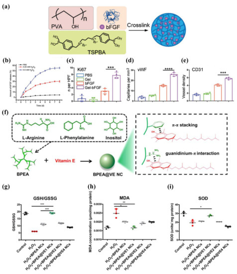 (a) Diagrammatic sketch of the preparation of bFGF loaded with PVA-TSPBA; (b) bFGF release behavior of bFGF loaded with PVA-TSPBA at various ROS concentrations. Quantitative data corresponding to Ki67 staining (c), vWF staining (d), and CD31 staining (e) (for statistical significance, *** p < 0.005 and **** p < 0.0001 (c–e)); (f) schematic illustration of BPEA@VE NC; (g) GSH/GSSG values in H2O2 and in BPEA@ VE NC-treated cells (for statistical significance, *** p < 0.001); (h) MDA concentration in H2O2 and BPEA@ VE NC-treated cells (for statistical significance, * p < 0.05 and ** p < 0.01); (i) SOD concentration in H2O2 and BPEA@ VE NC-treated cells (for statistical significance, * p < 0.05). bFGF, basic fibroblast growth factor; PVA, poly (vinyl alcohol); TSPBA, N1-(4-boronobenzyl)-N3-(4-boronophenyl)-N1, N1, N3, N3-tetramethylpropane-1, 3-diaminium; BPEA@VE NCs, branched poly (ester amide) nanocapsules loaded with vitamin E; GSH/GSSG, reduced glutathione/oxidized glutathione disulfide; MDA, malondialdehyde; SOD, superoxide dismutase. Adapted with permission from [43,44], published by Wiley, 2021 and American Chemical Society, 2021.