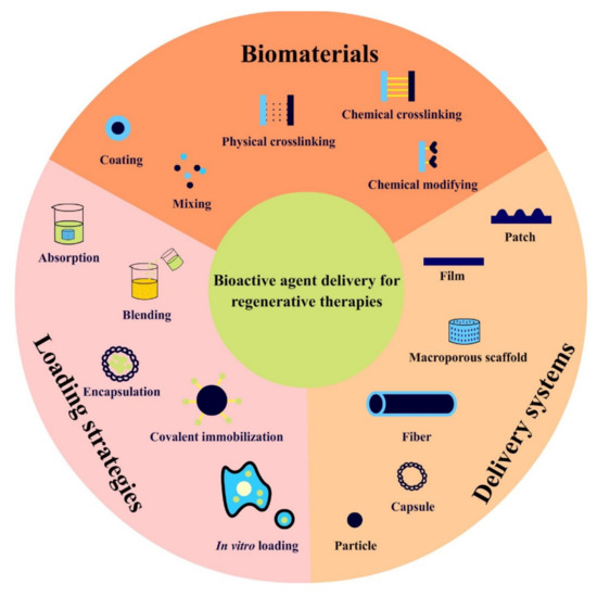 However, regarding the delivery of active compounds, there is still a significant gap for improvement in loading efficiency, stability, therapeutic activity, and their spatiotemporal controlled release profile. Therefore, various exploration steps have been taken to develop sophisticated bioactive agent delivery systems focused on the types of biomaterials, delivery systems, and loading strategies. For instance, to endow biomaterials with additional characteristics that are beneficial to regenerative therapies, different composite materials, crosslinking methods, and chemical modifications have been developed [15,16,17,18]. Furthermore, fabrication methods which may affect drug encapsulation, release, and biological efficacy, such as cell exosome production, three-dimensional (3D) printing, electrospinning, and microfluidics, have been used to produce diverse forms of delivery systems for the sequential delivery of therapeutic substances [19,20,21,22,23]. In addition, many types of loading strategies, such as adding stabilizing excipients, covalent immobilization, in vitro loading, and structure optimization have been utilized to enhance bioavailability and prevent burst release [24,25,26,27].