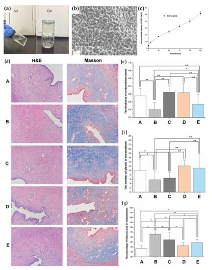 (a) Chitosan–heparin solution and chitosan–heparin hydrogel; (b) scanning electron microscope image of lyophilized chitosan–heparin delivery system; (c) in vitro releasing curves of SDF-1α in chitosan–heparin delivery system; (d) hematoxylin and eosin staining and Masson trichrome staining of uterus tissue at 7 days after surgery; The endometrial thickness (e), numbers of glands (f), and fibrosis area (g) of uterus in group A–E at 7 days after surgery. For statistical significance, ** p < 0.01 and * p < 0.05. A, control group; B, no treatment group; C, hydrogel only treated group; D, SDF-1α hydrogel treated group; E, SDF-1α treated group; SDF-1α, stromal cell-derived factor-1α; H&E, hematoxylin and eosin staining. Adapted with permission from [112], published by Elsevier, 2020.